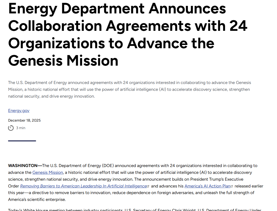 Remember, on November 28, 2025, I wrote a piece about the Executive Order "Launching the Genesis Mission". At the time, the Executive Order had just been signed. It was less than a month ago.